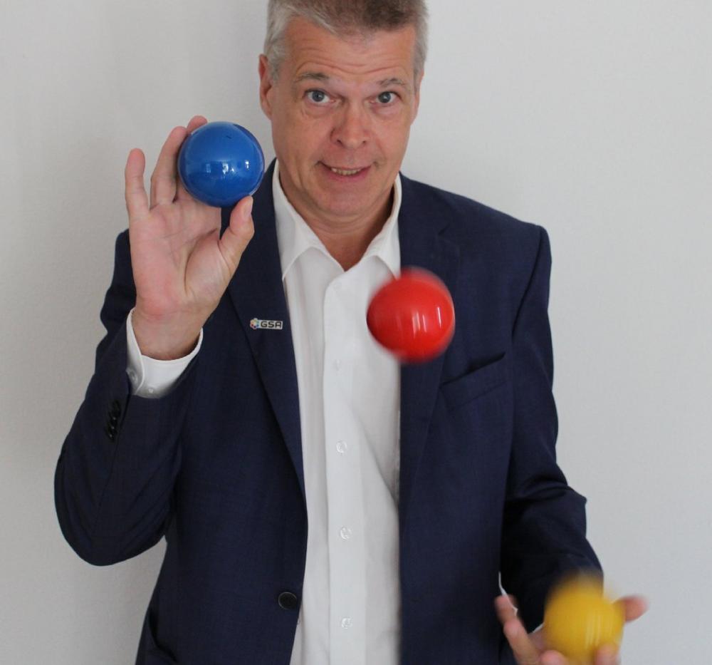 Jonglierbälle in einem Seminar? Bei einem Führungskräfte-Training? Thematisch eingebunden in Change? Ist das nicht Spielerei? NEIN, sagt Stephan Ehlers, Experte für Jonglieren und Lernen aus München. Er muss es wissen, denn er ist seit 20 Jahren mit Jonglieren im Business und in der Weiterbildung aktiv.