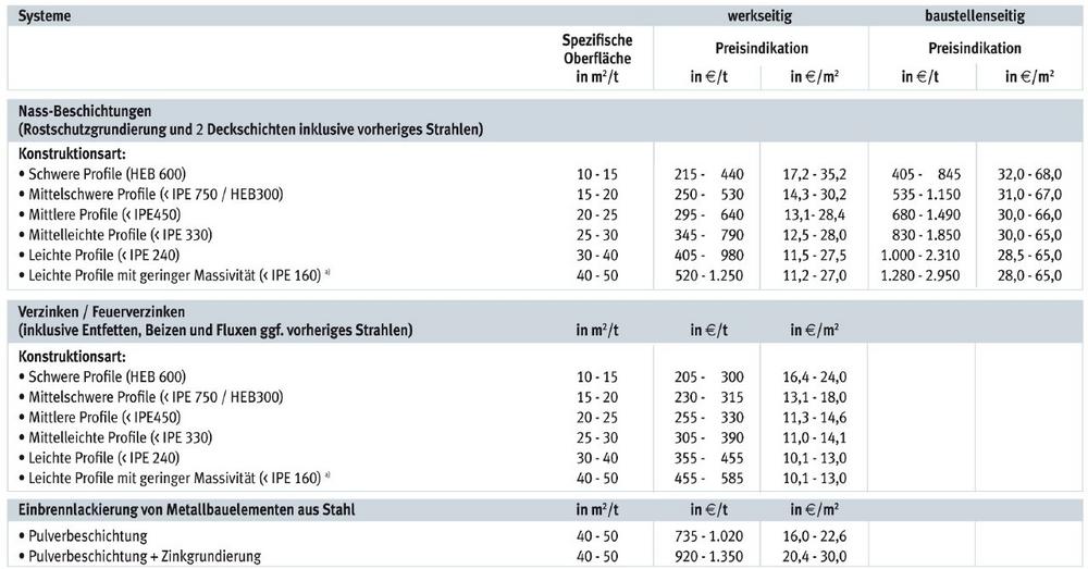 Der Leitfaden enthält Richtwerte für die Kostenplanung von Bauprojekten in Stahlbauweise, u.a. auch zu den Erstkosten von Korrosionsschutz- und Brandschutzsystemen. Die im Leitfaden enthaltenen Kostenindikationen wurden durch intensive Befragungen ermittelt. Hinsichtlich des Korrosionsschutzes zeigt sich bei allen Konstruktionsarten, dass die Feuerverzinkung im Rahmen der angegebenen Preisspannen im Mittel zwischen mehr als 20 und fast 40 Prozent günstiger ist als werkseitige Beschichtungen. Bei baustellenseitiger Beschichtung verdoppeln sich sogar die Preise. Zudem sind beim Feuerverzinken die Spannen zwischen dem höchsten und niedrigsten Preis deutlich geringer, was die Abschätzung realistischer Kosten für den Korrosionsschutz vereinfacht. Die Korrosionsschutzkosten beziehen sich auf Stahlbaukonstruktionen, Korrosionsschutzkosten für sogenannte Schlosserware sind nicht dargestellt. Erstmals berücksichtigt der Leitfaden auch die Feuerverzinkung im Kapitel Brandschutz. R30 ist vielfach mit ungeschützten, feuerverzinkten Stahlkonstruktionen erreichbar, so dass passive Brandschutzlösungen entfallen können. In diesen Fällen bietet die Feuerverzinkung zumeist auch die wirtschaftlichste Brandschutzlösung.