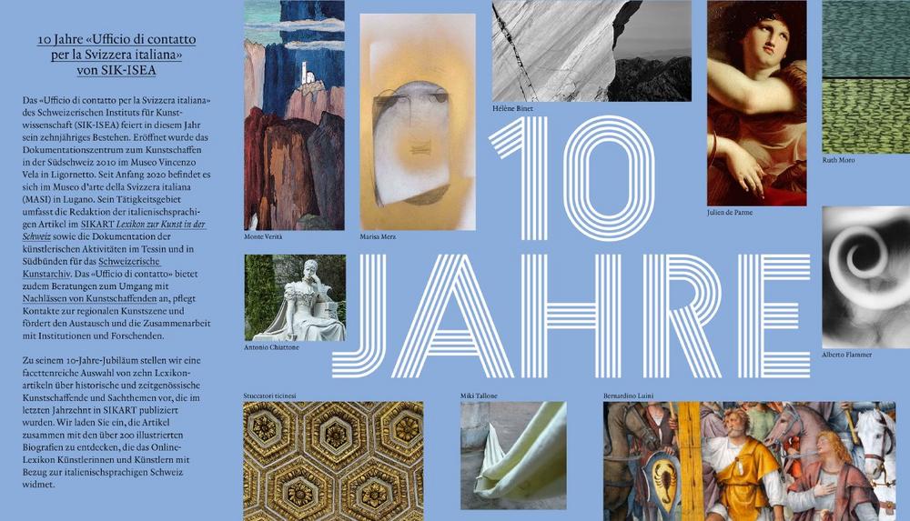 Das «Ufficio di contatto» von SIK-ISEA feiert in diesem Jahr sein zehnjähriges Bestehen. Sein Tätigkeitsgebiet umfasst die Redaktion der italienischsprachigen Artikel im SIKART Lexikon zur Kunst in der Schweiz sowie die Dokumentation der künstlerischen Aktivitäten im Tessin und in Südbünden für das Schweizerische Kunstarchiv. Das «Ufficio di contatto» bietet zudem Beratungen zum Umgang mit Nachlässen von Kunstschaffenden an, pflegt Kontakte zur regionalen Kunstszene und fördert den Austausch und die Zusammenarbeit mit Institutionen und Forschenden. Zu seinem 10-Jahre-Jubiläum stellen wir eine facettenreiche Auswahl von zehn Lexikonartikeln über historische und zeitgenössische Kunstschaffende und Sachthemen vor, die im letzten Jahrzehnt in SIKART publiziert wurden.