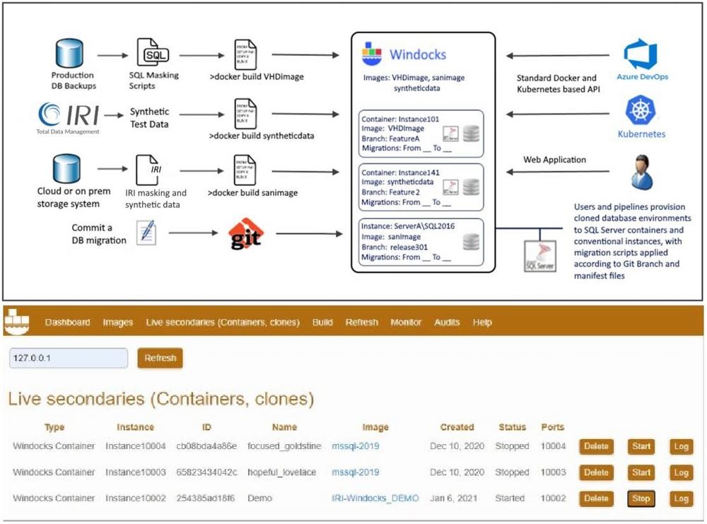 Die IRI-Windocks-Lösung nutzt die Geschwindigkeit und Sicherheit von Containern für das Testdatenmanagement. Das IRI-Windocks Testdaten-Repo bietet sichere testfertige Datenbank-Klone auf Abruf, für Container, konventionelle Instanzen und Workstations, on-premise oder in der Cloud.