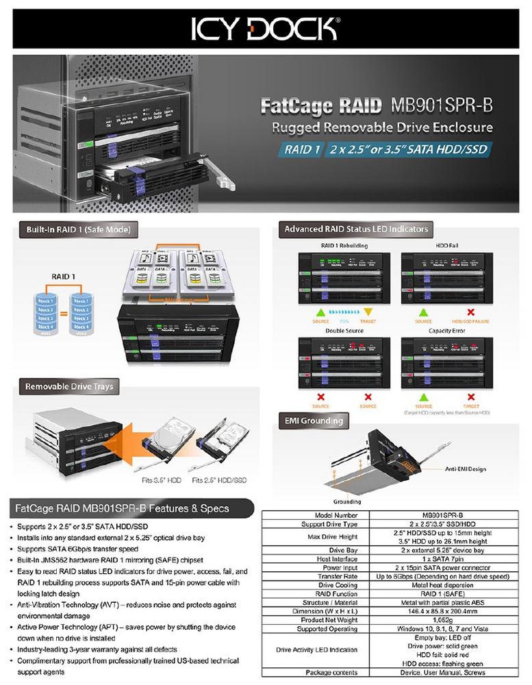 Mit dem eingebauten JMS562 Hardware RAID-Chipsatz können Sie mühelos zwei HDD/SSD RAID-Arrays zu jedem System hinzufügen, ohne eine RAID Controller-Karte zu benötigen. Der FatCage RAID MB901SPR-B spiegelt automatisch 2 x 2,5" oder 3,5" SATA HDD/SSD für Datenredundanz, um Systemausfälle durch den Defekt einer einzelnen Festplatte zu verhindern.