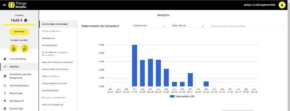 Über das Things Mobile-Portal können unzählige SIM-Karten komfortabel verwaltet, pausiert und aktiviert werden. Auch umfangreiche Statistiken zu Kosten und Datenverbrauch pro Gerät sind verfügbar.