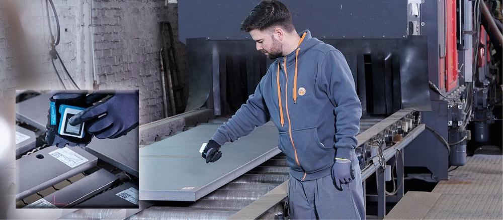 Neben der einfachen Integrierbarkeit und den Vorteilen auf der Softwareseite bietet der Scanner auch viele positive Aspekte in der Hardware. Vorteil des kleinen Handrückenscanners ist, dass er nur 45g wiegt. Beim Tragen fällt dieser auf dem Handrücken kaum auf. Die Mitarbeiter haben die Hände frei um die schweren Stahlbauteile zu kommissionieren. Dies erhöht auch erheblich die Arbeitssicherheit. Der integrierte Hochleistungsscanner erfasst bis zu vier Meter entfernte Barcodes. Barcodes auf Bauteilen die z.B. am Förderband weiter entfernt sind können somit problemlos abgescannt werden.