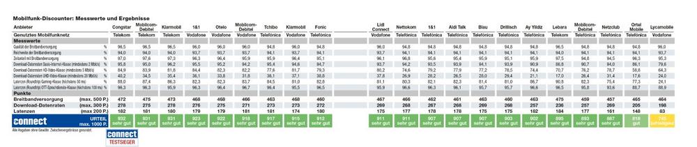 In dem 24-wöchigen Erhebungszeitraum zwischen dem 15.3.2021 und dem 29.8.2021 wurden die Discount-Anbieter 1&1, Aldi Talk, Ay Yildiz, Blau, Congstar, Drillisch, Fonic, Klarmobil, Lebara, Lidl Connect, Lycamobile, Mobilcom-Debitel, Nettokom, Netzclub, Ortel Mobile, Otelo und Tchibo getestet. Betrachtet wurden die Kategorien Breitbandversorgung, Download-Datenraten und Verzögerungszeit (Latenzen).