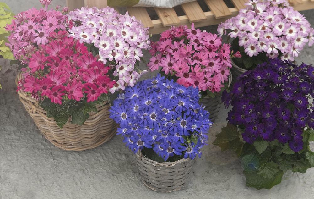 Mandala – der Begriff steht für ein geometrisches Schaubild, das auf einen Mittelpunkt ausgerichtet ist. Betrachtet man die Pflanzen mit ihren vielen Blüten von oben, passt der Name Mandala perfekt. Es steht eine breite Farbpalette von frischen Frühlingsfarben wie Blau, Violett, Rosa und Lachs bis hin zu einigen schönen zweifarbigen Sorten zur Verfügung. Die neuen pflegeleichten Hybrid-Serien von Senecio cruentus starten mit jeweils fünf Einzel-Sorten: Mandala® ‚Blue Charme‘ (Blau), ‚Peach‘ (Pfirsichfarben), ‚Pink Bicolor‘ (zweifarbig Hell- und Dunkelrosa), ‚Purple‘ (Violett), ‚Salmon‘ (Lachsfarben) sowie Mandala® ‚Plus Blue Charme‘ (Blau mit hellem Innenkreis), ‚Plus Rose Charme‘ (Rosa-Bordeaux-Rot mit heller Mitte), ‚Plus Royal Blue‘ (tiefes Dunkelblau), ‚Plus Sky Blue‘ (Himmelblau mit heller Mitte), ‚Plus ‚Plus Violet Bicolor‘ (Violett mit heller Mitte).