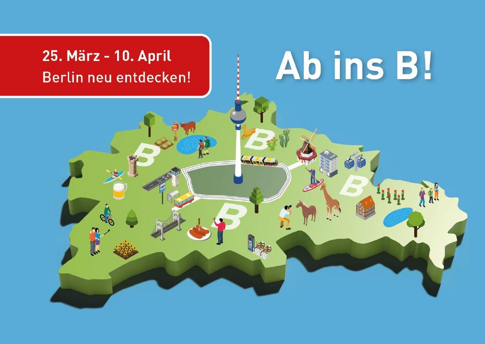 Vom 25. März bis zum 10. April 2023 veranstalten die neun Bezirke rund um die City die Entdeckertage „Ab ins B!“. Das B steht für die gleichnamige BVG-Tarifzone, mit der dieser Raum identisch ist. Damit bietet sich Hauptstadtbewohner:innen und Berlin-Besucher:innen die Gelegenheit, Berlin zwischen S-Bahnring und Stadtgrenze zu besonderen Konditionen zu entdecken. Denn nicht nur die City verfügt über ein umfangreiches touristisches Angebot, auch außerhalb des S-Bahnrings finden sich zahlreiche Sehenswürdigkeiten, Ausflugsorte und Geheimtipps, die Einheimische und Berlin-Liebhaber entdecken können.