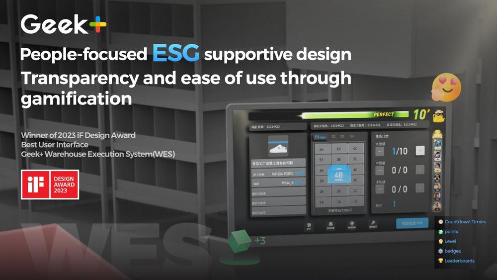 The Geekplus WES is a warehouse task execution system that goes beyond task scheduling to optimize and balance the collaboration between multiple automated units. The system incorporates ideas and theories of gamification to make it easy and enjoyable for warehouse employees to use, a key principle of sustainable design. The WES has been applied in several industries including, e-commerce, pharmaceuticals, and the automotive industries, among others.