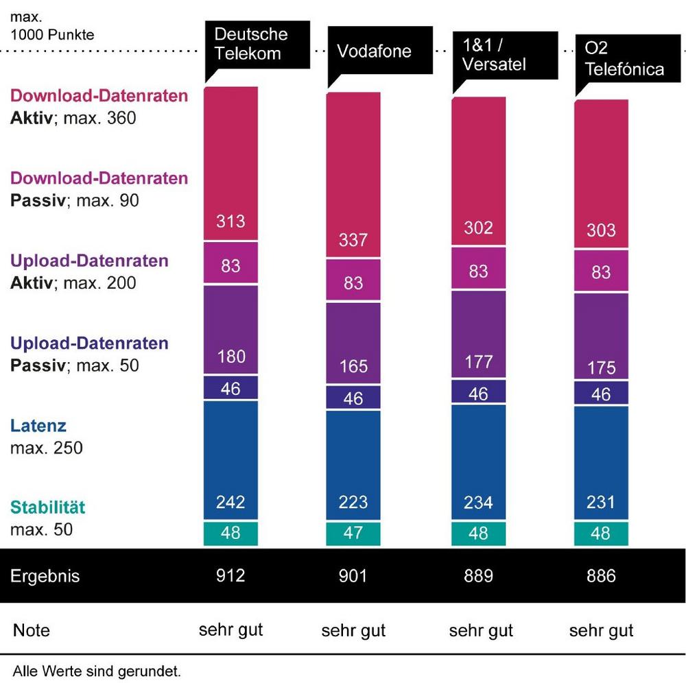 Die Deutsche Telekom ist Testsieger mit 912 von 1.000 möglichen Punkten und dem Testurteil „sehr gut“ – der Anbieter überzeugt bei Zuverlässigkeit, aktiven Upload-Messungen und mit sehr guten Latenzwerten, vor allem in den höheren Bewertungsklassen.