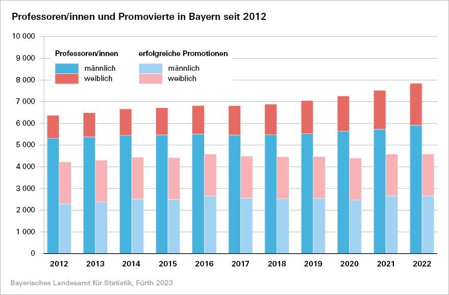 Zwei Drittel des wissenschaftlichen und künstlerischen Hochschulpersonals (68,3 Prozent oder 43 763 Personen) sind im Jahr 2022 hauptberuflich, etwa in einer Professoren-, Dozenten- oder Assistentenstelle, tätig. Die Zahl der Professuren ist im Vergleich zum Vorjahr um 4,3 Prozent (322 Personen) angestiegen. So lehren und forschen 1 932 Professorinnen und 5 914 Professoren an Bayerns Hochschulen.