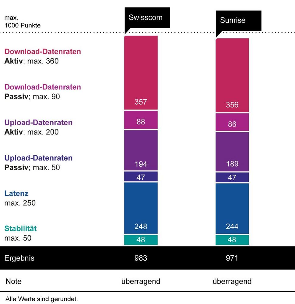 Den zweiten Platz erreicht Sunrise UPC mit 971 Punkten und der Note „überragend“. Bei den aktiv gemessenen Download-Datenraten erzielt der Anbieter einen Punkt weniger als Swisscom – obwohl Sunrise etwas höhere Durchschnittswerte als Swisscom erzielt, liegt dennoch die Mehrzahl in der Verteilung der Messwerte etwas niedriger. In den Punktewertungen für die passiv ermittelten Upload-Datenraten und in der Stabilität liegen Sunrise und Swisscom gleichauf.