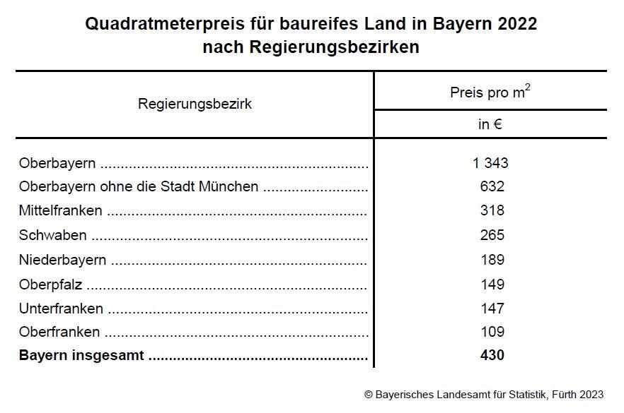 Wie das Bayerische Landesamt für Statistik weiter mitteilt, bestehen zwischen den einzelnen Regierungsbezirken große Preisunterschiede. So ist baureifes Land in Oberbayern mit durchschnittlich 1 343 Euro am teuersten. Wird die Stadt München nicht berücksichtigt, liegt der Quadratmeterpreis für Oberbayern um mehr als die Hälfte niedriger bei 632 Euro. In Mittelfranken müssen im Schnitt 318 Euro für den Quadratmeter bezahlt werden. In Schwaben (265 Euro) und Niederbayern (189 Euro) ist der Quadratmeterpreis deutlich geringer. Am niedrigsten sind die Werte für den Quadratmeter baureifes Land in der Oberpfalz (149 Euro), in Unterfranken (147 Euro) und in Oberfranken (109 Euro).