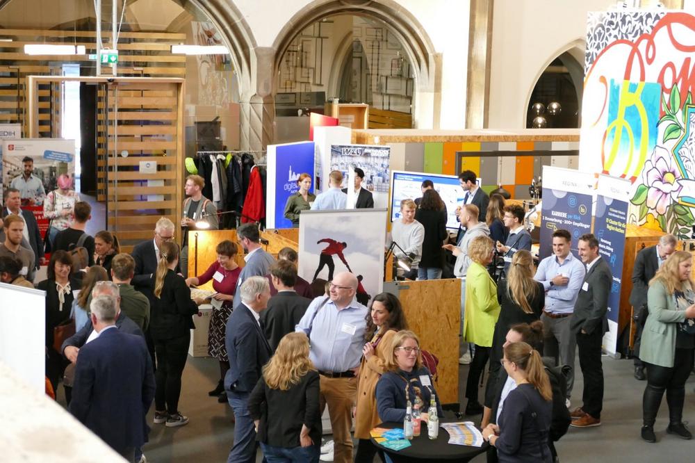 Um „Erleben“ und „Ins-Gespräch-kommen“ ging es auf dem „Marktplatz der Möglichkeiten“. Im Rahmen einer Ausstellung präsentierte jeder der 14 EDIH-Rheinland-Projektpartner eigene, beispielhafte Digitalisierungslösungen. So etwa eine digitalisierte Espressomaschine, die exemplarisch das Potenzial digitaler Geschäftsmodelle für physische Produkte verdeutlichte. Ein Roboter veranschaulichte die Einsatzmöglichkeiten künstlicher Intelligenz in Fertigungsumgebungen und auch das High Performance Computing wurde anhand von Anwendungsmöglichkeiten für leistungsstarke Simulationen greifbar gemacht. Die Ausstellung machte die Digitalisierung für das Publikum anfassbar. Sie vermittelte ein Bild zu Kompetenzen und Aktivitäten der Forschungspartner und inspirierte zum Austausch.
