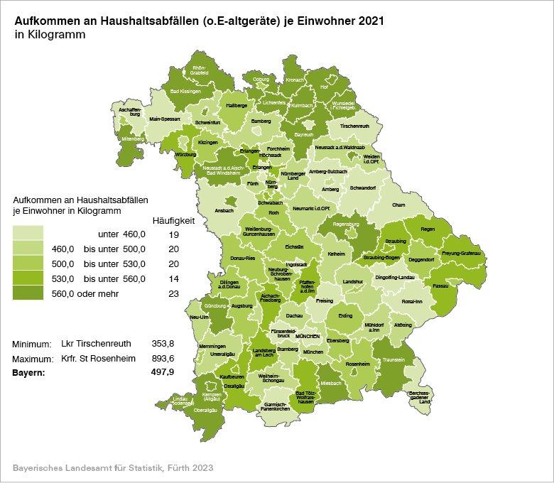 „Stadt.Land.Zahl“ ist ein Produkt im Internetangebot der Statistischen Ämter des Bundes und der Länder, welches regionale Vergleiche zulässt. Die Ergebnisse sind unter https://www.statistikportal.de/… abrufbar. Neu ist das Merkmal zum Abfallaufkommen pro Kopf. Beim regionalen Vergleich hat die kreisfreie Stadt Rosenheim im Jahr 2021 mit 893,6 Kilogramm pro Kopf das höchste Aufkommen an Haushaltsabfällen in Bayern. Deutschlandweit haben der Landkreis Euskirchen mit 968,0 Kilogramm und der Landkreis Ahrweiler mit 1 994,6 Kilogramm ein höheres Abfallaufkommen. Das geringste Pro-Kopf-Aufkommen an Haushaltsabfällen in Bayern weist der Landkreis Tirschenreuth mit 353,8 Kilogramm auf. Weniger Abfälle pro Kopf fallen bundesweit im Kreis Gotha mit 304,5 Kilogramm, im Saale-Holzland-Kreis mit 328,8 Kilogramm und im Landkreis Tübingen mit 349,7 Kilogramm an.