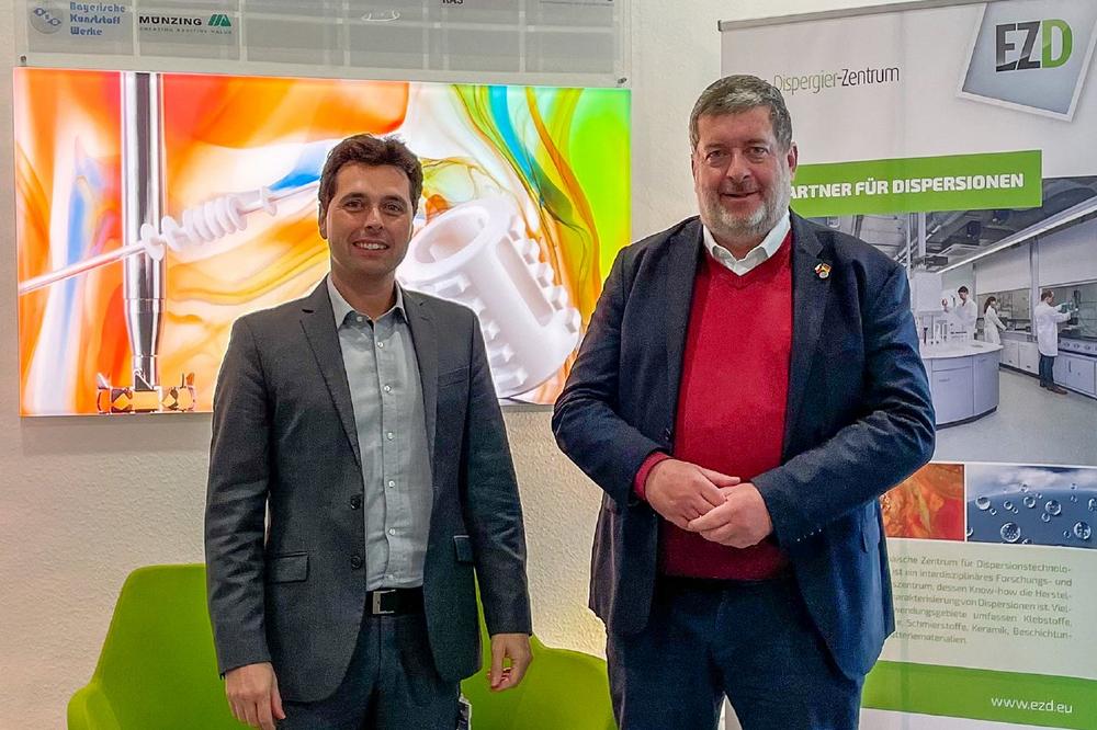 Nachdem die Erweiterung des Europäischen Zentrums für Dispersionstechnologien (EZD) in Selb im Juli 2023 feierlich in Betrieb genommen worden war, hat nun MdB Jörg Nürnberger die Forschungseinrichtung besucht und sich ein Bild der Aktivitäten der Forscher in Selb gemacht. EZD-Standortleiter Dr. Felipe Wolff-Fabris und SKZ-Vorstandsvorsitzender Prof. Dr.-Ing. Martin Bastian stellten sowohl das EZD und deren Entwicklung als auch sein Mutterinstitut das Kunststoff-Zentrum SKZ, ein Mitglied der Zuse-Gemeinschaft, vor. Anschließend fand ein Rundgang durch die neuen Räumlichkeiten statt.