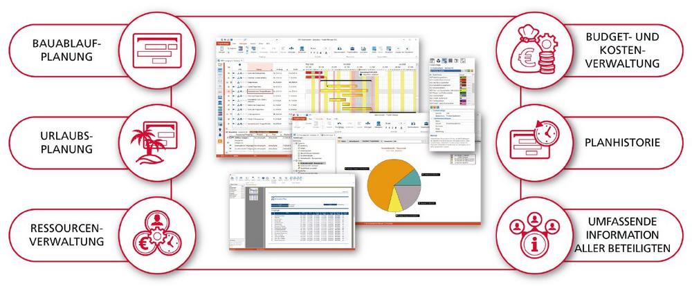 Die Produkte: Zu den vielen Softwareentwicklungen gehören, neben einer Projekt-Management-Lösung für die Bauablaufplanung und Ressourcenüberwachung, ein digitales Bautagebuch inkl. Mängelmanagement, eine Software zur Erstellung von Checklisten aller Art inkl. App für Android und iOS, eine Software zur Erstellung von Flucht- und Rettungsplänen sowie Feuerwehrplänen, eine Bildverortung zur Lokalisierung von Bildern in Plänen, eine Unternehmenscontrolling-Software nach PeP-7-Standard, ein HOAI-Berechnungsprogramm, SiGe-Software für den Sicherheits- und Gesundheitsschutz gemäß Baustellenverordnung, ein Programm zur Erstellung von Brandschutznachweisen, ein Programm zur Generierung von Brandschutzordnungen Teil A, B und C, eine CRM-Anwendung sowie zahlreiche digitale Formulare und Musterverträge.