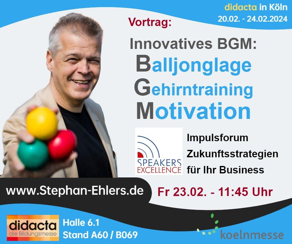Wer mehr über das Jonglieren und das „neue BGM“ erfahren und selbst erleben möchte, besucht den Vortrag von Stephan Ehlers beim Impulsforum „Zukunftsstrategien für Ihr Business“ von Speakers Excellence während der didacta (Halle 6.1/A060/B069) in Köln am Freitag, 23. Februar 2024 um 11:45 Uhr.