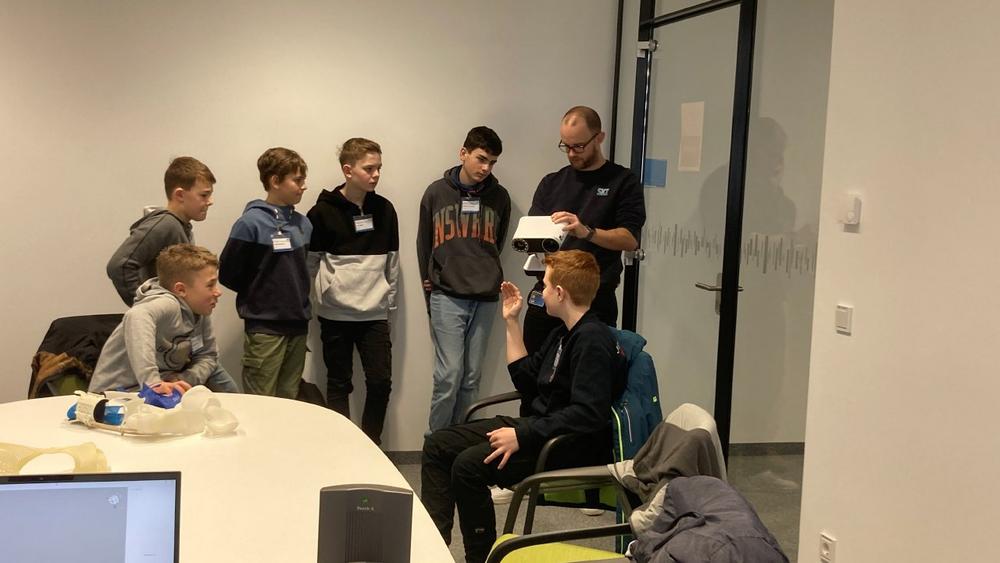 Für eine individuell angepasste Schiene ist zunächst ein Scan des Unterarms notwendig. Hierzu erklärte Kevin Popp, wissenschaftlicher Mitarbeiter und Konstruktionsexperte am SKZ, den Jugendlichen die Herausforderungen und Lösungsmöglichkeiten digitaler Fertigung. Mit Hilfe des Handscanners „Artec Leo“ wurde der Arm zweier Schüler detailgenau gescannt. Anschließend wurden die Daten über eine Software für den 3D-Druck aufbereitet.