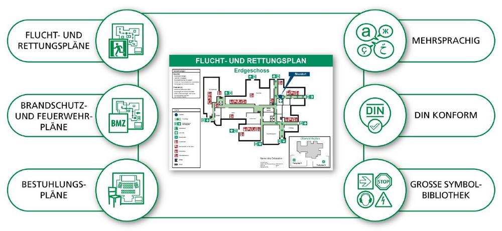 Die Software Fluchtplan 2024 wurde beispielsweise speziell für die einfache Erstellung mehrsprachiger Flucht- und Rettungspläne sowie Feuerwehrpläne gemäß DIN ISO 23601 konzipiert. Grafik- oder CAD-Kenntnisse sind nicht erforderlich. Auf der Grundlage importierter digitaler Pläne, gescannter Papierpläne oder mit dem Programm automatisiert erstellter Grundrisse müssen lediglich Fluchtwege gekennzeichnet, Flucht- oder Rettungswegesymbole aus einem individuell erweiterbaren Katalog ausgewählt und eingefügt werden. Raumflächen werden automatisch erkannt und eingefärbt. Linien- und Flächenfarben, Planmaßstäbe, Symbolgrößen für Sicherheitszeichen, Schrifthöhen oder Linienbreiten sind stets normkonform und alle im Plan verwendeten Symbole werden automatisch aufgelistet und erläutert. Vorlagen für Titel, Planrahmen und Planlegende, Verhaltenstafeln oder das Stempelfeld vereinfachen die Planerstellung zusätzlich. Neue Funktionen in der Version 2024 rationalisieren Arbeitsabläufe zusätzlich. So können jetzt PDF-Pläne aus mehreren Teilplänen, beispielsweise verschiedenen Geschossen, zusammengefügt und auch im Archivformat PDF-A ausgegeben werden. Auch die Grundriss-Eingabe wird einfacher: So lassen sich Fenster und Türen zwischen vorhandenen parallelen Linien und Füllungen automatisch einfügen, Objekte in einzelne Zeichnungselemente zerlegen und anschließend modifizieren. Verbessert wurde auch die Editiermöglichkeit von im Modul "Brandschutzplanung" enthaltenen Bauteilen und Textobjekten innerhalb von Gruppen. Informationen wie Objekt, Geschoss, Auftraggeber, Verfasser oder Plannummer können jetzt auch als Textfeld eingefügt und verwaltet werden, um beispielsweise universell verwendbare Planstempel zu gestalten. Außerdem lassen sich Abbildungen jetzt auch mit erweiterten Funktionen, wie Belichtungsanpassung, Retuschieren, Filter etc. bearbeiten.
