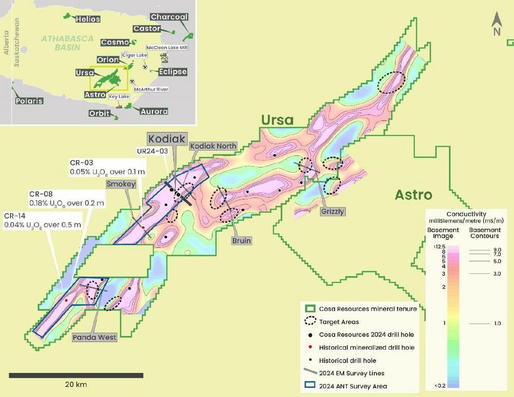 Keith Bodnarchuk, President & CEO, commented: “The completion of these geophysical programs at our 100% owned Ursa, Orion, Aurora, and Orbit projects marks another important step in Cosa’s path to developing a pipeline of drill targets across much of our prospective and highly underexplored portfolio of uranium projects. We consider the recent winter drilling results and identification of sandstone hosted structure and alteration to be a major success for the Company and are eager to use the results of the ANT work at Ursa to guide follow up drilling later this summer. With the completion of our $6.5m bought deal financing earlier this year, we are fully funded to pursue exciting drill targets at Ursa while also bringing the Orion, Aurora, and Orbit projects up to drill-ready status for 2025.”