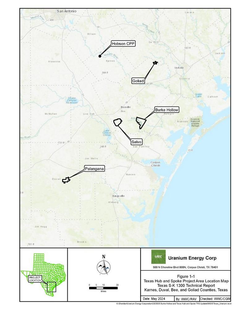 The Platform consists of five project areas (“Figure 1-1”): the Hobson Central Processing Plant (“CPP”); and the Burke Hollow, Goliad, Palangana and Salvo projects; which are located in Karnes, Bee, Goliad and Duval Counties, Texas. The Hobson CPP will serve as the ‘hub’ of the Platform, with the other project areas serving as satellite facilities, or the ‘spokes’. The Hobson CPP will process all the uranium recovered in each of the other project areas. The Texas Platform is in the South Texas Uranium Province (“STUP”), which is part of the coastal plain portion of the Gulf of Mexico Basin (“GMB”).
