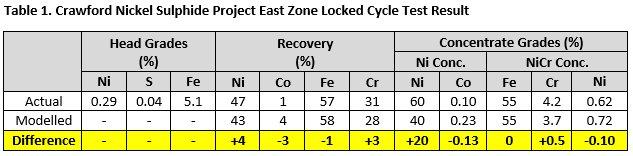 Table 1 summarizes the results from the locked cycle test which was completed on a composite of samples taken from the Feasibility Study, East Zone starter pit. The composite had a head grade of 0.29% nickel, 0.04% sulphur, 5.1% iron and contained heazlewoodite-awaruite style mineralization. The composite delivered a total nickel recovery of 47% which exceeded the modelled recovery target by 9% or 4 percentage points of recovery. The composite also supported the potential for high grade concentrate production as the nickel sulphide concentrate product graded 60% nickel. The magnetic recovery circuit also performed well as the iron recovery fell within 1 percentage point of the modelled recovery and the chromium recovery exceeded the modelled recovery by 3 percentage points and the concentrate grade target was achieved.
