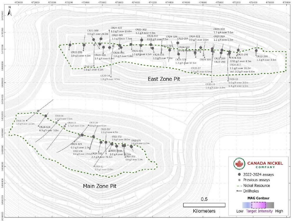 The purpose of the 2024 drill program was to provide sufficient infill drilling to produce a resource estimate on the PGM zones. Canada Nickel successfully intersected mineralized peridotite/pyroxenite in 28 of the 31 holes drilled. Assay results from both the 2022 and 2024 programs are tabulated in Table 1 and shown in Figure 2.