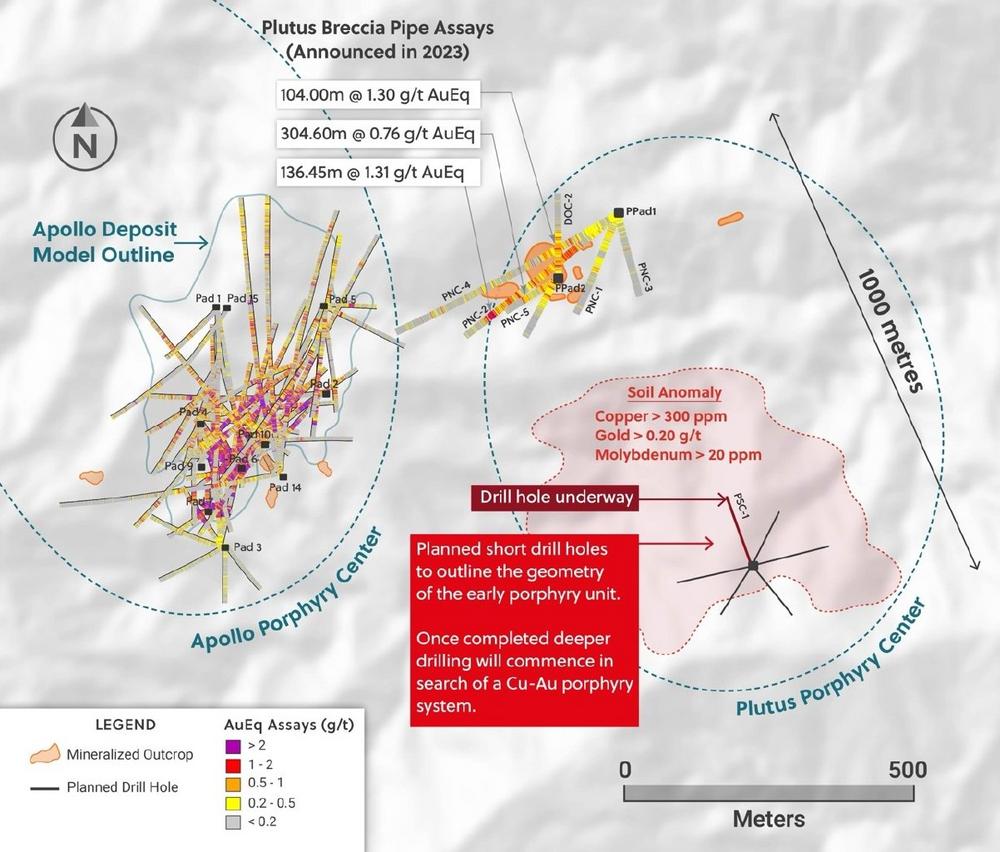 - Das Ziel Plutus, das etwa 1.000 Meter östlich von Apollo liegt, misst eine Fläche von 1.000 mal 750 Metern und ist in alle Richtungen offen. Bisher wurden bei Plutus zwei Ziele umrissen: ein unerprobtes Kupfer-Gold-Porphyr-Ziel im Süden und ein Brekzienrohr-Ziel im Nordwesten. Frühere Untersuchungsergebnisse von Bohrungen im Jahr 2023 im Brekzienrohr-Ziel im Nordwesten ergaben mehrere breite Abschnitte, einschließlich 136,45 Meter mit 1,31 g/t AuEq (siehe Pressemitteilung vom 11. Oktober 2023).