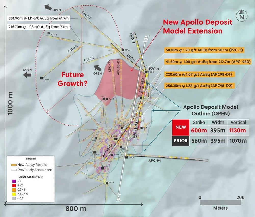 - The revised Apollo model, covering the portion of the mineralization that has been wire-framed, now covers a significantly expanded volume measuring up to 600 metres of strike by 395 metres of width by 1,130 metres vertical and remains open for expansion in most directions. Mineralization at Apollo daylights at surface (i.e. 271 metres @ 3.43 g/t AuEq from 0 metres depth in APC-43; see press release dated April 11, 2023) and has been drilled up to 1,130 metres below surface (i.e. 202 metres @ 2.16 g/t AuEq at 1,130 metres depth in APC88-D1; see press release dated January 30, 2024). The internal model only encompasses the southern portion of the newly discovered and integrated system with plans now in place to aggressively expand Apollo in a northerly direction while continuing to target high-grade subzones within the wireframed portion of the system.