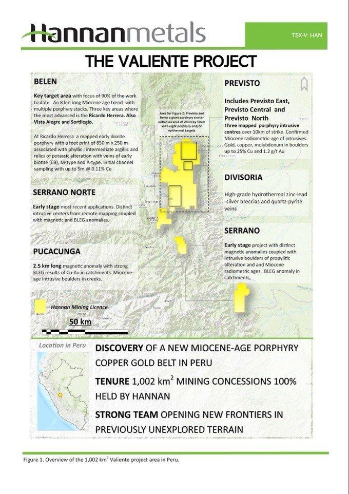 Michael Hudson, CEO, erklärt: "Im Laufe dieses Jahres haben wir im hinteren Bogen von Peru in einem Gebiet von 25 km mal 10 km in den Gebieten Previsto/Belen, die zum zu 100 % im Besitz befindlichen Projekt Valiente gehören, ein bisher unbekanntes Porphyrcluster in Bezirksgröße aus dem Miozän entdeckt. Wir haben nun acht porphyrische und/oder epithermale Ziele im Detail identifiziert, wobei bis zu 10 Ziele in einem früheren Stadium auf weitere Arbeiten warten. "