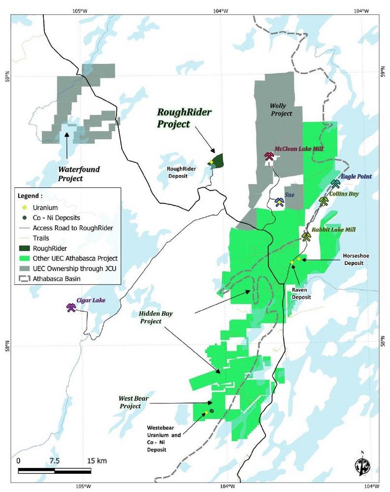 Das Projekt Roughrider ist ein Uranprojekt im östlichen Athabasca-Becken im Norden von Saskatchewan, Kanada, einem der wichtigsten Uranabbaugebiete der Welt. Das Projekt befindet sich etwa 13 Kilometer westlich der Mühle McClean Lake von Orano, in der Nähe der bestehenden Grundstücke von UEC im Athabasca-Becken. Die Tiefe der Mineralisierung auf dem Projekt beträgt etwa 200 Meter und befindet sich hauptsächlich im Grundgestein unterhalb der Diskordanz.