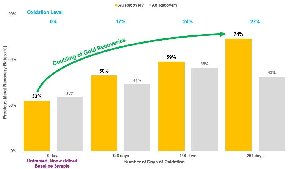 The results above also highlight an improvement in silver recoveries by applying the Technology relative to an untreated, non-oxidized baseline sample. After 146 days, the oxidation process increased the silver recoveries by over 20%. Silver represents approximately 30% of the economic value of Metates. Future test work will focus on improving and optimizing the conditions to increase the silver recoveries.