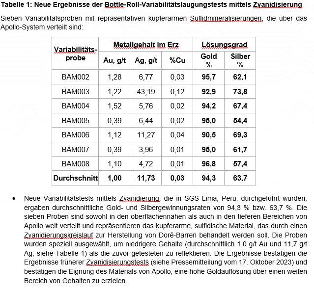 - Neue Variabilitätstests mittels Zyanidierung, die in SGS Lima, Peru, durchgeführt wurden, ergaben durchschnittliche Gold- und Silbergewinnungsraten von 94,3 % bzw. 63,7 %. Die sieben Proben sind sowohl in den oberflächennahen als auch in den tieferen Bereichen von Apollo weit verteilt und repräsentieren das kupferarme, sulfidische Material, das durch einen Zyanidierungskreislauf zur Herstellung von Doré-Barren behandelt werden soll. Die Proben wurden speziell ausgewählt, um niedrigere Gehalte (durchschnittlich 1,0 g/t Au und 11,7 g/t Ag, siehe Tabelle 1) als die zuvor getesteten zu reflektieren. Die Ergebnisse bestätigen die Ergebnisse früherer Zyanidisierungstests (siehe Pressemitteilung vom 17. Oktober 2023) und bestätigen die Eignung des Materials von Apollo, eine hohe Goldauflösung über einen weiten Bereich von Gehalten zu erzielen.