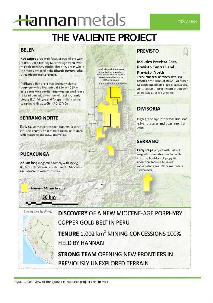 Im Jahr 2021 steckte Hannan 1.002 km2 an Bergbaukonzessionen bei Valiente ab, die sich zu 100 % in seinem Besitz befinden und unerforschtes Terrain für potenzielle mineralisierte Porphyrziele im zentralen Osten Perus abdecken. Frühe Schürfungen an der Oberfläche entdeckten zwei auffällige Kupfer-Gold-Porphyr-Ziele und ein epithermales Ziel bei Belen (siehe Pressemitteilung vom 16. Februar 2023), das nun für Bohrungen freigegeben wird (Abbildungen 1 und 2). Porphyr-Entdeckungen folgten rasch bei Serrano Norte, Serrano und Pucacunga. In jüngster Zeit lag der Schwerpunkt auf Previsto. Bei Previsto und Belen, einem Porphyr-Cluster im Distriktmaßstab in einem Gebiet von 25 km x 10 km, wurden acht porphyrische und/oder epithermale Ziele genauer identifiziert, wobei bis zu 10 Ziele in einem früheren Stadium auf weitere Arbeiten warten.