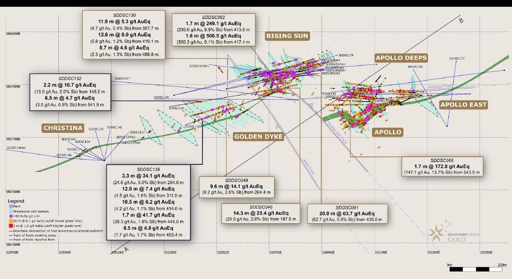 SDDSC138 was drilled east to west, parallel to and within the dyke/breccia host structure (the ladder “rails”) and intercepted twelve mineralised vein sets (the ladder “rungs”) across Rising Sun and Golden Dyke, while testing a prospective corridor of 292 m (cumulative downhole length of dyke and sericite/carbonate altered sediment). SDDSC138 included 15 intercepts of Au > 20 g/t (up to 183 g/t Au) and 19 intercepts of Sb > 5% (up to 33.8% Sb). This hole drilled up to 250 m below surface and 55 m to 85 m above and parallel to SDDSC130 (reported September 05, 2024) which provided continuity of mineralised structures, some relatively close to surface:
