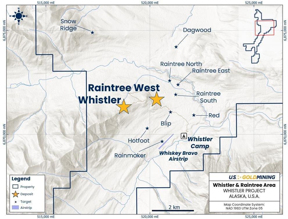 Wie am 27. Juni 2024 berichtet, begann das Unternehmen mit Diamantkernbohrungen auf der Lagerstätte Raintree West, bevor es Anfang Juli zur Lagerstätte Whistler überging (siehe Abbildung 1).