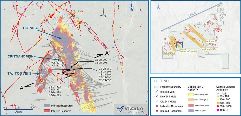 The precious metals dominant Copala structure, located in the western portion of the Panuco district, is situated ~800 m to the east of the Napoleon Vein. Copala currently hosts Indicated Resources of 83.3 Moz AgEq at 573 g/t AgEq and Inferred Resources of 48.3 Moz AgEq at 476 g/t AgEq within a broad envelope of vein-breccia interlayered with host rock, up to 82 metres thick (please refer to our Technical Report on Updated Mineral Resource Estimate for the Panuco Ag-Au-Pb-Zn Project, Sinaloa State, Mexico, by Allan Armitage, Ben Eggers and Peter Mehrfert, dated February 12, 2024 and Vizsla’s press release dated January 8, 2024). Observations by Vizsla geologists indicate Copala has an average dip of ~46° to the east (~35° in its northern sector and steepening to ~65° in the southern sector).