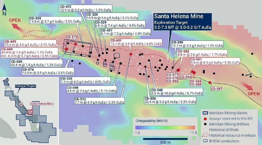 - Meridian’s CD-605 drills 6m @ 4.6g/t AuEq / 3.1% CuEq at Santa Helena;