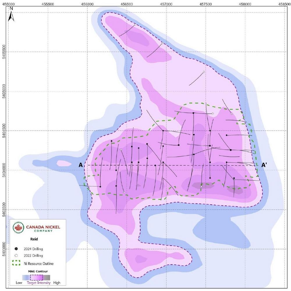 The Reid Nickel Sulphide Project is located just 16 kilometres southwest of the Company’s Crawford Nickel Sulphide Project (“Crawford”) and is more than twice the size of Crawford based on the outline of its geophysical target of 3.9 square kilometres. The area of the geophysical target covered by the Reid resource represents approximately 55% of the total target area. The Reid project is now accessible year-round by an exploration road constructed by Canada Nickel during the fall of 2024.