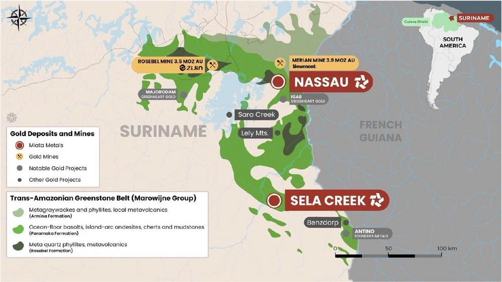 • Die Akquisition positioniert Miata strategisch als Multi-Asset-Explorer in Suriname mit zwei Goldprojekten, Sela Creek und Nassau (Abbildung 1), die zusammen über 400 km2 des produktiven Marowijne-Grünsteingürtels, der Teil des Guayana-Schildes ist, abdecken.