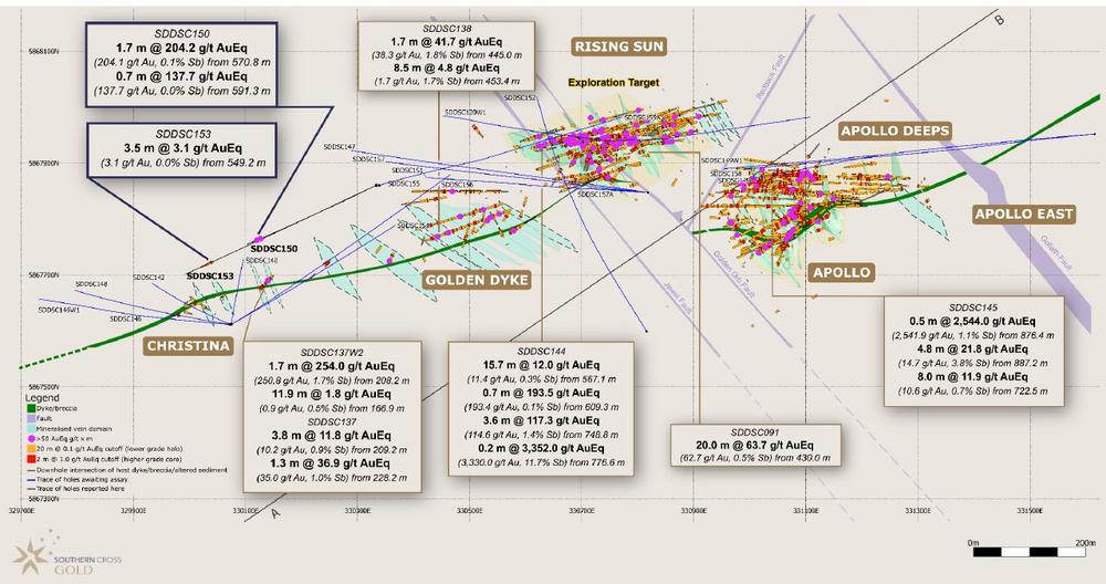 – 0.7 m @ 137.7 g/t AuEq (137.7 g/t Au, 0.0% Sb) from 591.3 m, including:3 m @ 340.0 g/t AuEq (340.0 g/t Au, 0.0% Sb) from 591.3 m - A second control hole, SDDSC153, was drilled to 390 m vertically below Christina and intercepted a prospective corridor of 45 m. Highlights include: