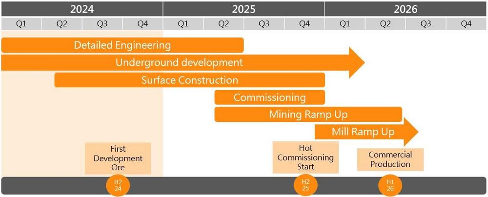 - Die Bauarbeiten an der Oberfläche sind zu etwa 24 % abgeschlossen, und der Gesamtzeitplan für die kommerzielle Produktion im ersten Halbjahr 2026 liegt weiterhin im Plan.