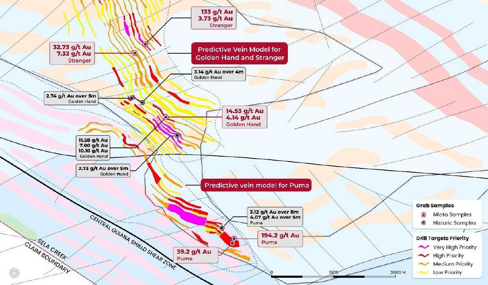 The Puma target in the southeast part of Sela Creek is characterized by intense hydrothermal alteration and repeating vein sets in a host of both metasedimentary and metavolcanic rocks. The Puma target has never been drilled but has been actively mined in the past decade by artisanal miners*. An in situ grab sample*, collected from one of the cross-cutting tension veins at Puma returned 194.2 g/t Au (with repeat analysis of 184.7 g/t Au), only 30 meters from a subparallel tension vein that returned 39.2 g/t Au in 2024. Both grab samples* are along a 500 meter-long northwest trend with historic channel samples* that returned 3.12 g/t Au over 8 meters and 4.07 g/t Au over 5 meters and are considered part of a single trend. This sample was highlighted in the Company news release of February 5, 2025. Further sampling at the Puma target is currently being conducted in the lead up to drilling.