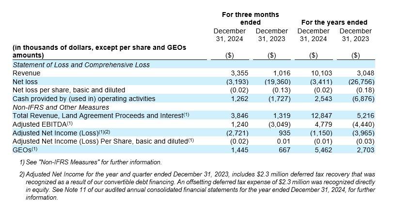 We have included, in this document, certain performance measures, including: (i) Adjusted Net Income (Loss) and Adjusted Net Income (Loss) Per Share, basic and diluted; (ii) GEOs; (iii) Total Revenue, Land Agreement Proceeds and Interest; and (iv) Adjusted EBITDA, which are each non-IFRS measures. The presentation of such non-IFRS measures is intended to provide additional information and should not be considered in isolation or as a substitute for measures of performance prepared in accordance with IFRS. These non-IFRS measures do not have any standardized meaning prescribed by IFRS, and other companies may calculate these measures differently.