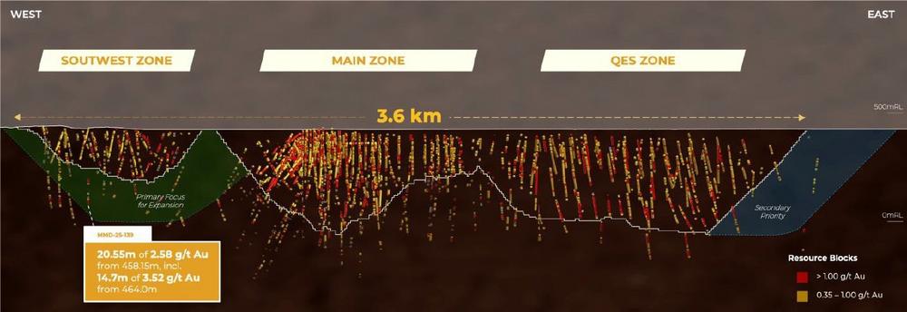 1. Erweiterung der Ressource im südwestlichen Teil der Lagerstätte durch Bohrungen unterhalb des derzeitigen konzeptionellen Tagebaus im Anschluss an Bohrloch MMD-24-139, das 20,55 m mit 2,58 g/t Au auf 458,15 m durchschnitt, einschließlich 14,7 m mit 3,52 g/t Au, und