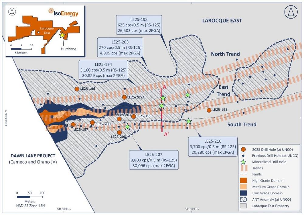 - South Trend – Drilling along the projected extension of the J and K faults intersected strong radioactivity, confirming potential continuity east of Hurricane. Hole LE25-207, located 240 m east of Hurricane, returned an average RS-125 reading on over 0.5 m on core of 8,800 cps and a corresponding downhole probe maximum reading of 30,096 cps, while LE25-210, drilled 480 m east of Hurricane, intersected up to 3,700 cps averaged over 0.5 m on core and a corresponding downhole probe maximum reading of 20,280 cps.