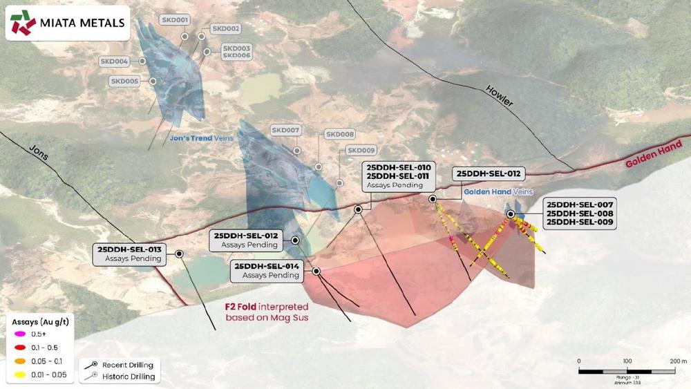 “We are pleased to announce assays for our first nine drill holes, accounting for the first 1,447m of our 10,000m drill program,” stated Dr. Jacob Verbaas, CEO of Miata. “Our results include several shallow intercepts of gold-bearing structures in bedrock such as 7.5m at 1.05 g/t Au from 13.5m and 2m at 4.72 g/t Au from 19.3m. This area now represents a compelling open-pit target. We continue to use this valuable data to vector towards the core of the Golden Hand target, where four holes have already been drilled with assays pending. We look forward to results of the continued drilling and expanding the drill targeting to the six other high-priority targets on Sela Creek.”
