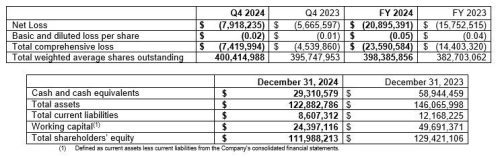 Das Unternehmen hat insgesamt 3.229.529 $ durch die Ausgabe von 9.127.085 Flow-Through-Aktien zu einem Preis von 0,35 $ Bruttoeinnahmen in Höhe von 3.194.479,75 $ erzielt sowie 100.142 Hard-Dollar-Einheiten zu einem Preis von 0,35 $, bestehend aus 100.142 Stammaktien und 50.071 Warrants, was Bruttoeinnahmen in Höhe von 35.049,70 $ entspricht. Das Angebot wurde weitestgehend zu denselben Bedingungen abgeschlossen wie die bereits am 9. Mai 2025 bekannt gegebene, nicht vermittelte Privatplatzierung des Unternehmens in Höhe von 1,0 Millionen $, die mit Einnahmen in Höhe von 3,5 Millionen $ überzeichnet war und am 27. Mai bzw. 2. Juni 2025 abgeschlossen wurde.
