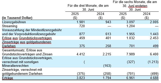 Der Gesamtumsatz, die Erlöse aus Grundstücksverträgen und die Zinsen werden ermittelt, indem die Erlöse aus Grundstücksverträgen, die mit anderen Mineralienanteilen verrechnet werden, und die Zinsen aus goldgebundenen Darlehen zum Gesamtumsatz hinzugerechnet werden. Wir haben diese Informationen aufgenommen, da die Unternehmensleitung davon ausgeht, dass bestimmte Anleger diese Informationen verwenden, um unsere Leistung im Vergleich zu anderen Goldlizenzgebührenunternehmen in der Edelmetallindustrie zu bewerten.