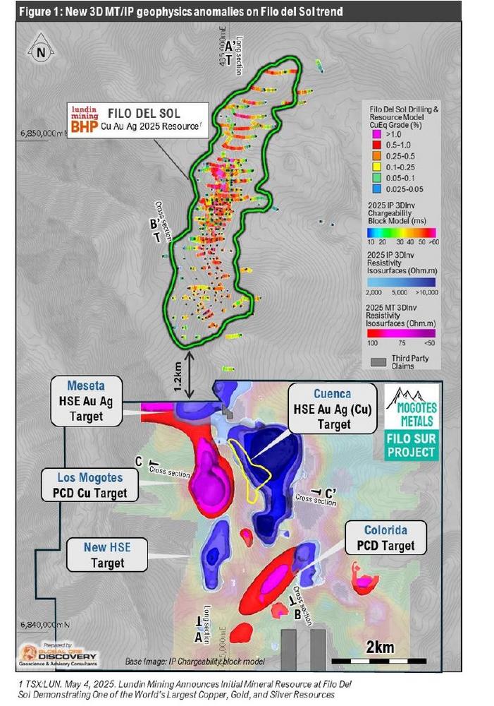 Mogotes Metals Inc. (TSXV: MOG, FSE:OY4, OTCQB: MOGMF) (“Mogotes”, or the “Company”) – https://www.commodity-tv.com/ondemand/companies/profil/mogotes-metals-inc/ – is pleased to announce that integrated processing of Mogotes 2025 and 2023 IP/MT geophysical data has delivered a compelling 3D geophysical model that outlines a series of compelling large-scale anomalies within the Company’s Filo Sur project. The geophysical anomalies are located directly on trend to the south of the large BHP/Lundin Filo Del Sol (FDS) resource1 and represent high priority Mogotes drill targets for porphyry copper (PCD) and High Sulfidation Epithermal (HSE) gold – silver mineralization (Figure 1 & 2).