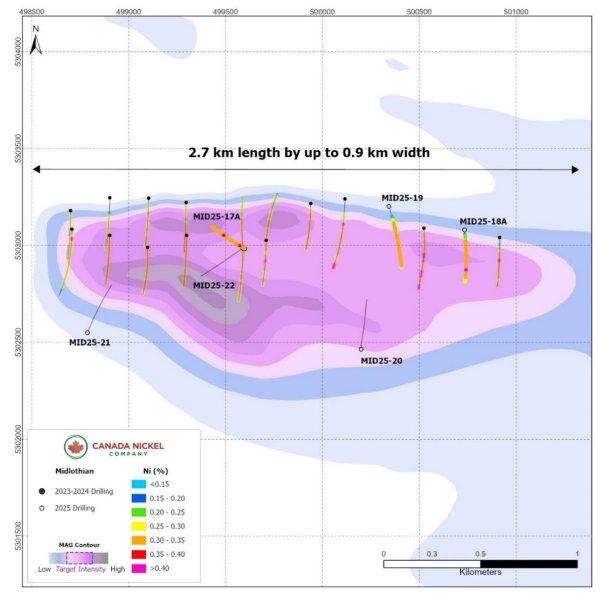 Das Grundstück Midlothian ist das ganze Jahr über direkt über eine Straße erreichbar. Midlothian ist ein Joint Venture zwischen Canada Nickel, Canadian Gold Miner Corp. und Laurion Mineral Exploration Inc. und befindet sich im letzten Jahr einer vierjährigen Vereinbarung, in deren Rahmen Canada Nickel eine Abschlusszahlung in Höhe von 400.000 Dollar leisten und 140.000 Aktien ausgeben muss, um eine 100-prozentige Beteiligung an dem Grundstück zu erwerben.  Im Sommer 2025 wurden sechs Infill-Bohrlöcher fertiggestellt. Alle sechs Bohrlöcher durchschnitten lange, weitgehend zusammenhängende Abschnitte mit mineralisiertem Dunit, wobei die beiden Bohrlöcher, die oberhalb der Mineralisierung angelegt wurden, diese in einer geringen Tiefe von weniger als sieben Metern durchschnitten (Abbildung 1). Diese Bohrlöcher wurden auf einem geophysikalischen Zielgebiet mit einer Länge von 2,7 Kilometern und einer Breite von 0,4 bis 0,9 Kilometern gebohrt, wobei die Zielfläche 1,7 km² groß ist (im Vergleich zur Zielfläche von Crawford mit 1,5 km². Diese Pressemitteilung enthält Untersuchungsergebnisse zu drei abgeschlossenen Bohrlöchern. Die Untersuchungsergebnisse zu den drei verbleibenden Bohrlöchern stehen noch aus. Mit dem kombinierten Datensatz (Bohrungen 2023, 2024, 2025) beabsichtigt das Unternehmen, bis Ende 2025 eine erste Ressourcenschätzung für Midlothian zu erstellen.